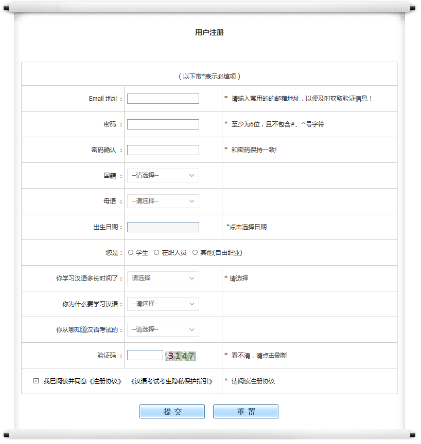 Online registration process for Chinese tests are showed as follow:1. Log into the website( www.chinesetest.cn)2. Signing up. Please provide necessary personal information including e-mail address, nationality, mother language, birth date and so on.3. Test registration. Please select test center and date, complete your personal information , upload ID photo and finally confirm your registration...
