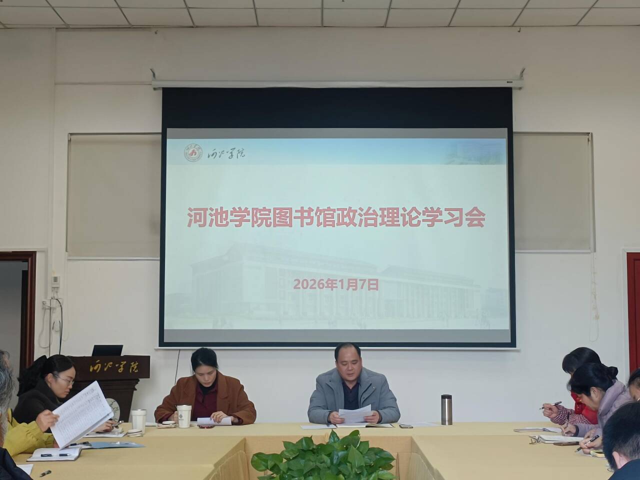 会上,大家集体学习了《河池学院“十六个字”办学治校新理念内涵解读》《北山答卷之十二:图书馆是大学之心》、河池学院2026年新年贺词和即将施行的《全民阅读促进条例》等内容。