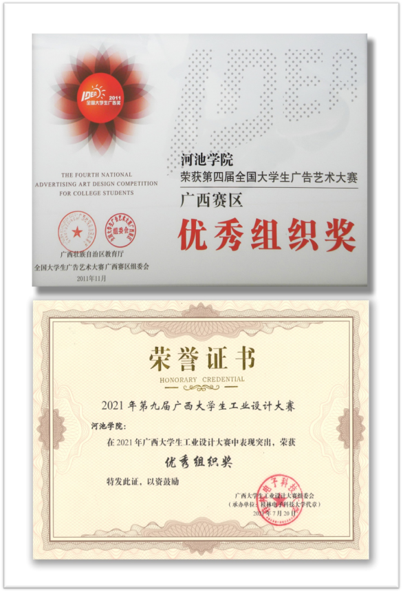 920187月,刘芝伶、陈思羽同学在全国大学生工业设计大赛广西赛区中分别获得一等奖;黎梅娇、武志豪、谢志平、罗兆余等同学分别荣获二等奖。刘芝伶同学在全国大学生工业设计大赛中荣获入围奖。