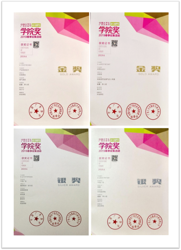 820186月,韩巧玲、符栢文同学在“第四第十届全国大学生广告艺术大赛广西赛区荣获一等奖;凌宏伟、曾童、王艺龙、韦瑞贤、林淑媚、黄诗婷、曾童、韩巧玲、符栢文同学分别荣获二等奖。