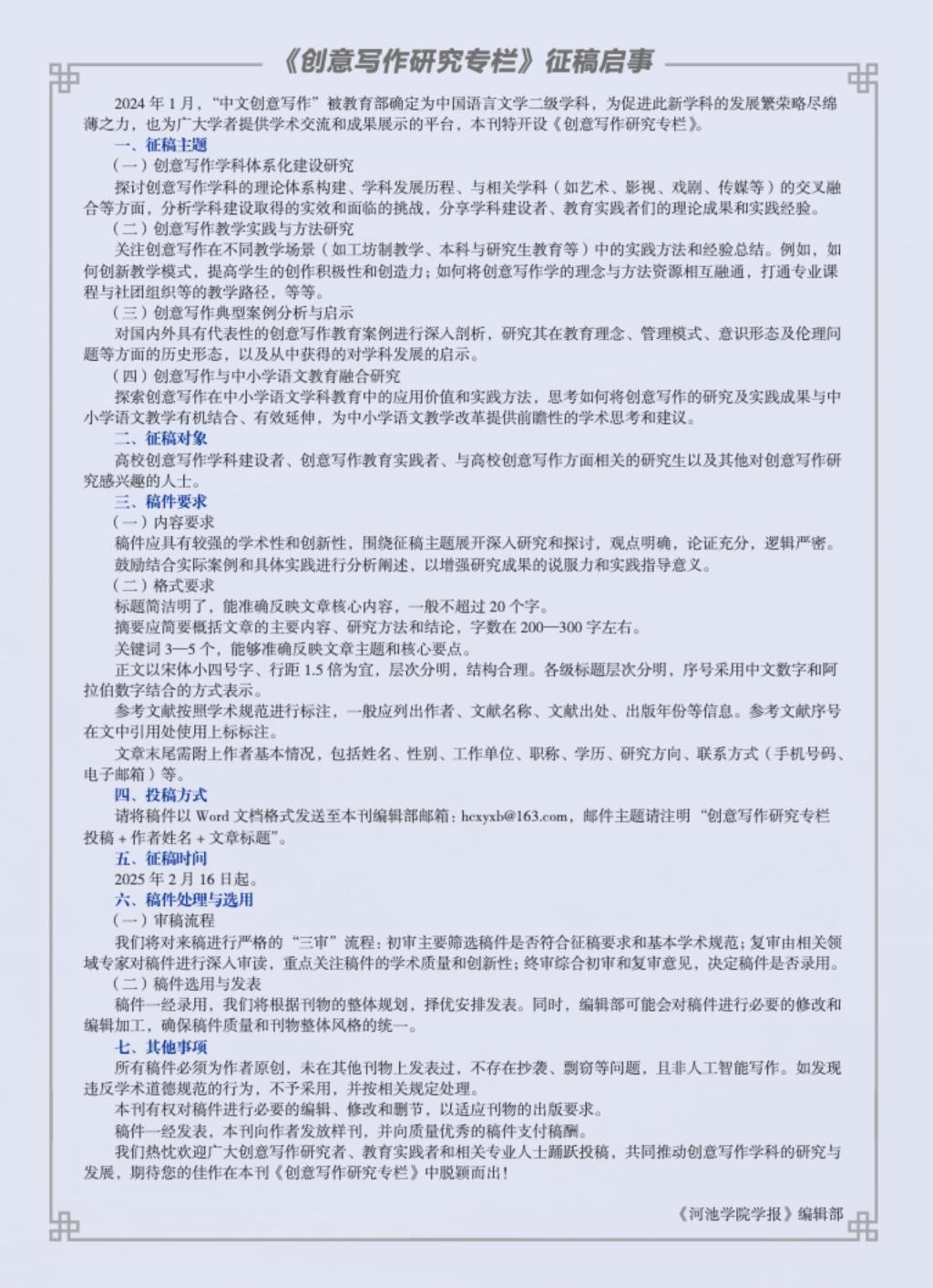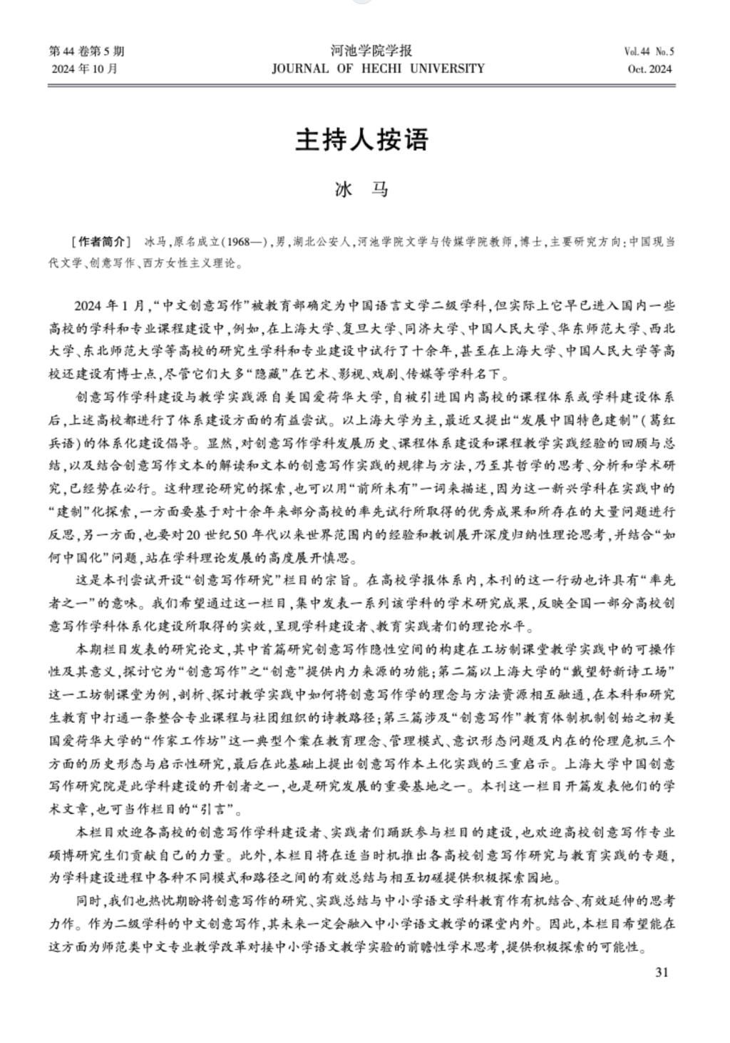 《河池学院学报》依托学校文学写作人才培养的办学特色和资源,邀请学校文学与传媒学院冰马博士担任栏目主持人,从2024年第5期开始开设常设栏目“创意写作研究”。栏目旨在反映高校创意写作学科体系化建设所取得的实效,呈现学科建设者、教育实践者们的理论思考,是目前高校学报中唯一一家开设“创意写作研究”常设栏目的学报。学报从2024年第5期开始至今,已经刊发了张永禄、谭旭东等专家、学者撰写的12篇论文,内容涉及创意写作的发展、学科的理论体系构建、各高校创意写作教育教学实践、不同文体案例分析等;作者来自上海大学、温州大学、西北大学、井冈山大学、云南大学、赣南师范大学、澳门科技大学等高校。未来学报将继续加强与相关高校、学者、教育者的联系与交流,开拓稿源,促进栏目的长期建设。(撰文黄猛,校对黄倩昵,审核李波)