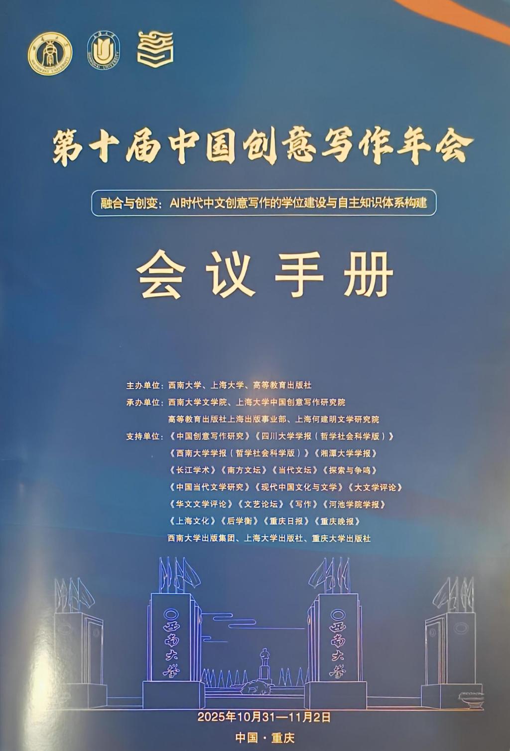 2025年10月31日至11月2日,第十届中国创意写作年会(2025)在西南大学举行。本届年会以“融合与创变:AI时代中文创意写作的学位建设与自主知识体系构建”为主题,由西南大学、上海大学、高等教育出版社联合主办,由西南大学文学院、上海大学中国创意写作研究院、高等教育出版社上海事业部等单位共同承办。本次会议设3场主题报告活动、12个线上线下论坛,来自全国100余所高校及相关机构的近400名专家、学者、作家、教育者及研究生齐聚山城重庆,以线上线下相结合的形式,共探中文创意写作的多元形态、发展路径与未来方向。