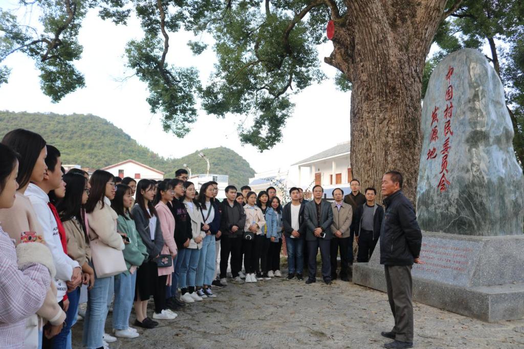 学院利用村民自治特色资源开展实践教学和科学研究,依托宜州村民自治发源地的资源优势,开展农村基层治理、乡风文明、村落文化、脱贫攻坚、乡村振兴等研究。成立有“民族地区基层民主与法治建设研究团队”,通过加强和基层政府、村庄合作,共建社会实践基地。先后邀请了“改革先锋”韦焕能作报告,组织了学生深入村民自治发源地合寨村、村民自治深化地木寨村开展实践教学。团队通过挖掘典型经验和治理新模式,探索、打磨可推广、可复制的河池经验,把科研成果转化为实践教学内容。