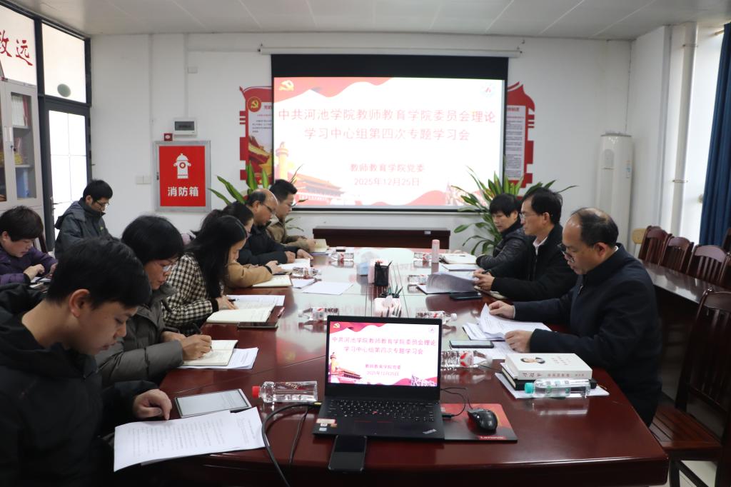 2025年12月25日上午,教师教育学院党委理论学习中心组在格致楼712会议室召开2025年第四次专题学习会。会议围绕深入学习领会党的二十届四中全会精神,《习近平谈治国理政》第五卷及习近平总书记近期重要讲话精神展开,旨在全力推进学校、学院赶超式高质量发展。学院党委书记韦晖主持会议,学校党委常委、办公室主任、统战部部长罗昌勤出席指导。