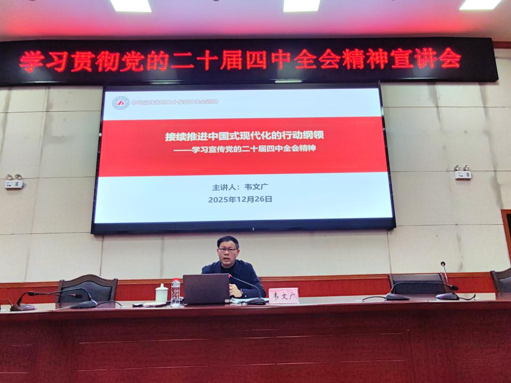 12月31日下午,学校副书记韦文广受邀为音乐舞蹈学院、美术与设计学院师生宣讲党的二十届四中全会精神。宣讲会以“持续推进中国式现代化的行动纲领——学习宣传党的二十届四中全会精神”为主题,由美术与设计学院党委书记韦联华主持,两学院教职工、无党派人士代表及学生党员共同聆听。