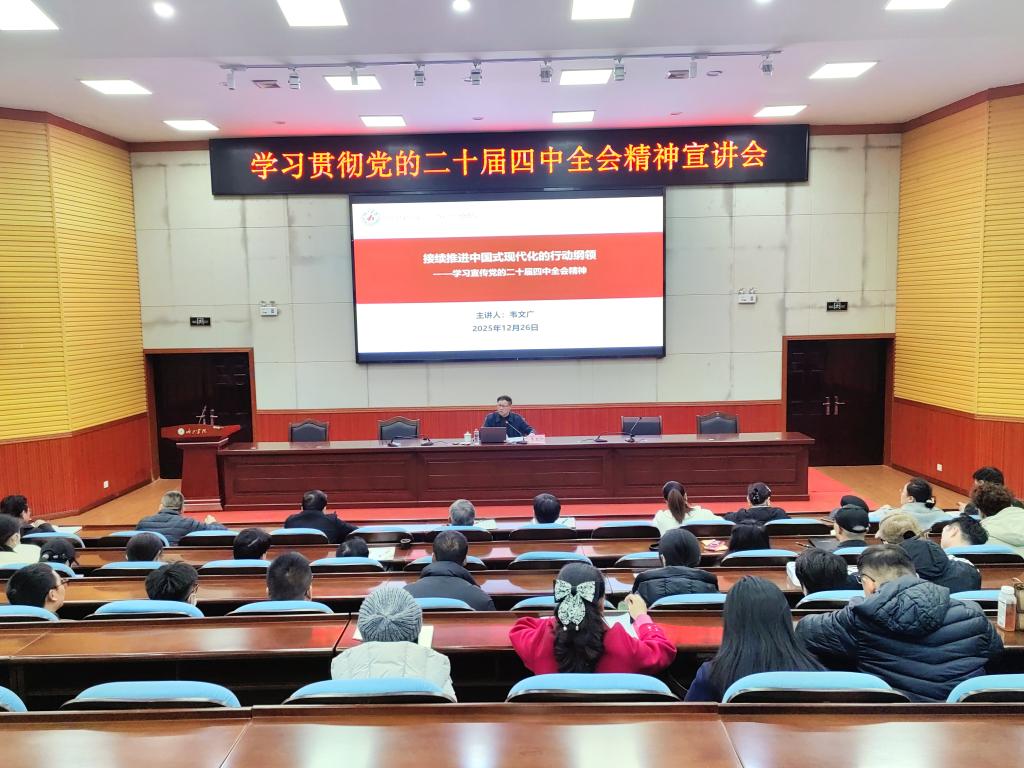 韦文广围绕党的二十届四中全会精神展开系统解读。其一,结合国际国内形势,全面分析全会召开的时代背景,深刻阐明全会在新发展阶段推进中国式现代化的战略考量;其二,聚焦《中共中央关于制定国民经济和社会发展第十五个五年规划的建议》核心内容,深入阐释“十五五”时期我国经济社会发展的总体目标、重点任务与重要举措,助力师生精准把握党中央战略部署;其三,立足高校实际,就贯彻落实全会精神提出明确要求,强调要坚持党的全面领导,将学习成果转化为推动教育教学、艺术创作和人才培养的实际成效。