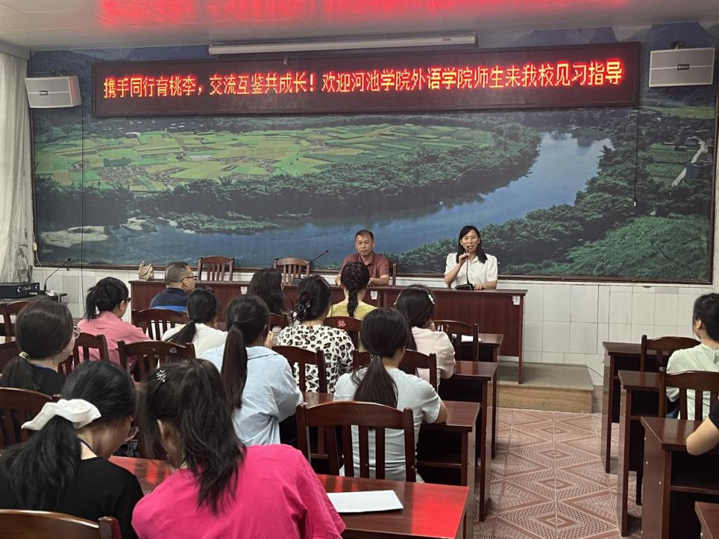 英语223班、英语224班的学生于4月21日到达桂宜高中开展见习活动。首先,学院见习师生出席了桂宜高中举办的见面会,桂宜高中校长韦毅华在仪式上对我院见习学生表示热烈欢迎,并对本次见习提出殷切希望和纪律要求;教务科副科长覃桂琴老师对实习活动做了具体安排和指示。李艳飞副院长表示,非常感谢桂宜高中提供宝贵的见习机会,希望同学们谦虚学习,期待与桂宜高中继续加强合作。接着,学生分为多个小组分别进入班级中观摩英语课。见习期间,老师们向同学们展示教学示范课,让同学们参与了许多日常教学管理工作,同学们表示受益匪浅。