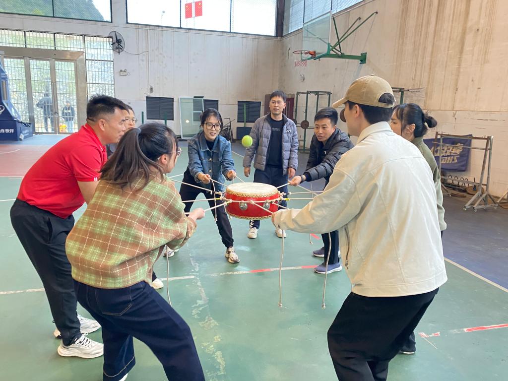 活动开始,体育学院辅导员张钱伟老师带领全体辅导员进行热身,通过一系列破冰游戏,营造出轻松愉快的活动氛围,为后续运动项目的顺利开展打下基础。随后,全体辅导员分为三组,先后参与了“六人七足竞走”“六人集体夹球走”和“同心击鼓”三项趣味运动项目。在“六人七足竞走”项目中,小组成员两两绑腿,协同竞走,展现了卓越的身体协调能力和团队默契。“六人集体夹球走”项目则考验了小组成员的创新思维能力和问题解决能力。最后的“同心击鼓”项目,小组成员通过牵拉绳子控制鼓面,在共同颠球的过程中提升了团队的凝聚力和协作效率。整个活动过程中,辅导员们不仅体验了运动的乐趣,得到身心的放松与锻炼,而且在竞技中增进了相互之间的沟通交流,加深了对团队协作重要性的理解与认识。