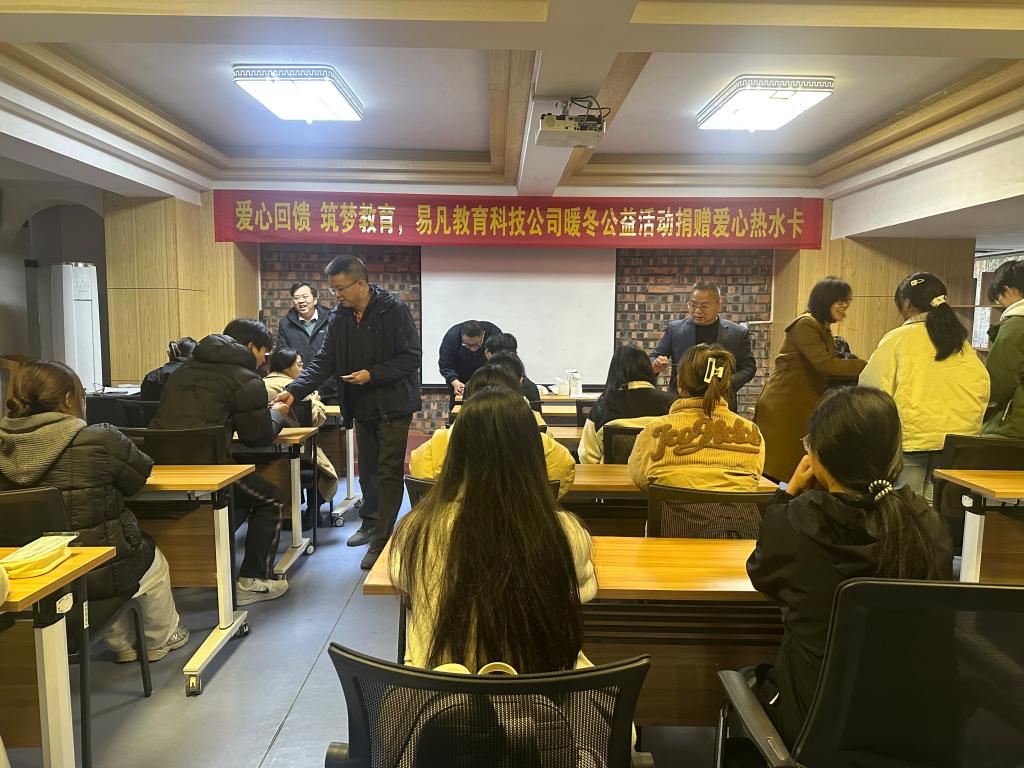 2025年12月24日,后勤管理处(基建处)联合易凡教育科技公司举办“爱心回馈 筑梦教育”暖冬公益捐赠活动,活动中,易凡教育科技公司为我校勤工助学学生捐赠面值50元热水卡1200张,总价值60000元。后勤管理处(基建处)副处长蓝凛为勤工助学学生代表发放爱心热水卡并在活动结束后与学生和企业代表合影留念,定格下这温暖的瞬间。