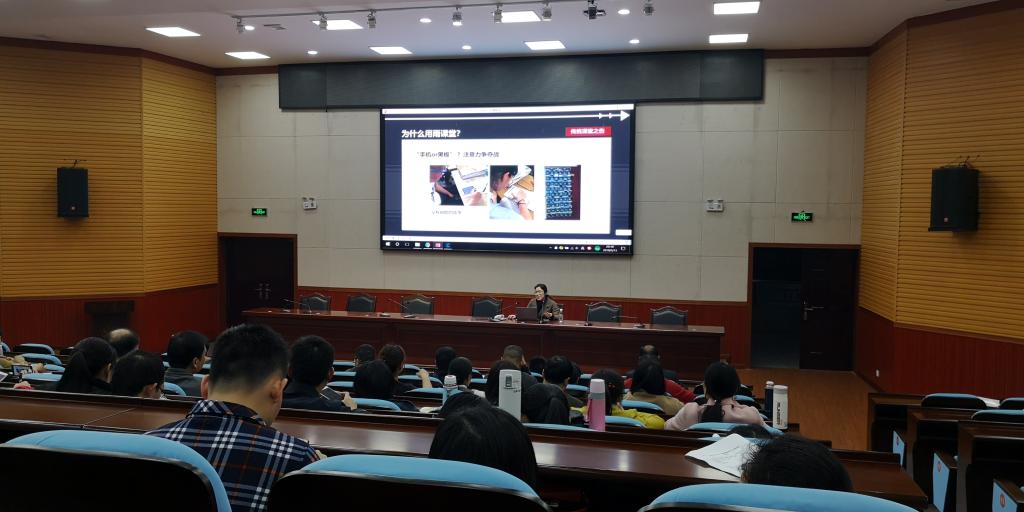 在试点工作中,现代教育技术中心与教务处协同负责教育信息化设施、环境的保障和技术支持。为保证试点工作在新学期推进,现教中心与教务处密切配合,制定了有针对性、形式多样灵活的信息技术培训计划。3月13日晚上,现教中心与教务处在东校区弘毅楼一区205报告厅举办《给课堂配备大脑---智慧教学辅助软件“雨课堂”的应用》的专题培训,共有八十余多名试点课程教师团队的任课老师参加了培训。培训由曾获得教育部在线教育研究中心在线教育“智慧教学之星”荣誉称号的陆东钰老师主讲,她模拟课堂场景,向老师们介绍了使用“雨课堂”PC端、手机端软件,实现班级和课程设立、随堂提问和考试、考勤、分组、课件推送、弹幕等丰富的课堂互动功能。活泼、高效的课堂互动方式,以及精确的教学过程数据,给老师们惊喜连连。除了全校层面的培训,现教中心还根据各个二级学院的要求,派老师到二级学院里进行教师的集中培训,目前已有马克思主义学院、经管学院进行了教师集体培训。