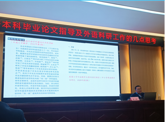 在教学工作方面,吴教授围绕“如何做好本科毕业论文指导”这一教学工作重点,从本科毕业论文的性质、其写作目的及存在的主要问题等方面细致剖析了毕业论文指导前期工作应该留意的重点内容,指出毕业论文指导教师对学生选题、文献阅读、研究方法、逻辑范式和工作态度等方面的把控会直接决定学生论文的最终质量。因此,毕业论文指导教师应该指导学生做好毕业论文选题敲定、研究问题明确和写作提纲拟定等前期工作,并以此为基础展开后续指导。