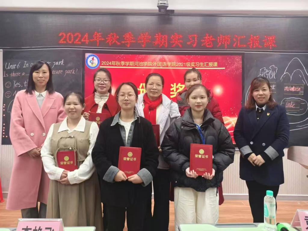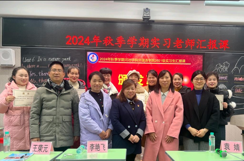 紧接着,梁春碧老师从专业角度对实习生的课堂教学进行了深入评析。河池学院袁婧老师则对实习生的上课技能进行了精准点评,既肯定了实习生的亮点,也指出了提升空间,并对实习生寄予厚望,明确了未来职业发展所需的教学技能。副院长李艳飞对本次汇报课进行了总结,向实习生表达了祝贺,并展望了与宜州区第一小学的持续深入合作。最后,伴随着颁奖和合影留念,本次实习生汇报课画上了圆满的句号。