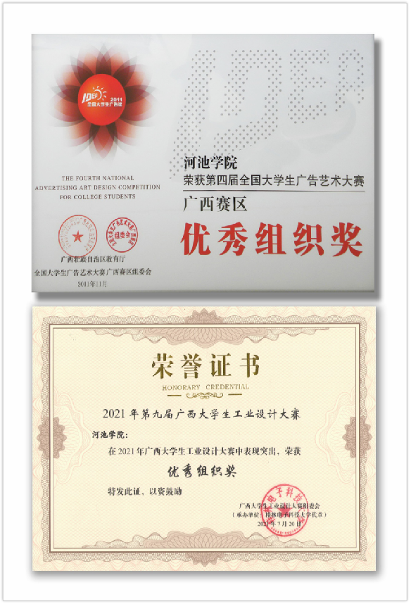 9.20187月,刘芝伶、陈思羽同学在全国大学生工业设计大赛广西赛区中分别获得一等奖;黎梅娇、武志豪、谢志平、罗兆余等同学分别荣获二等奖。刘芝伶同学在全国大学生工业设计大赛中荣获入围奖。