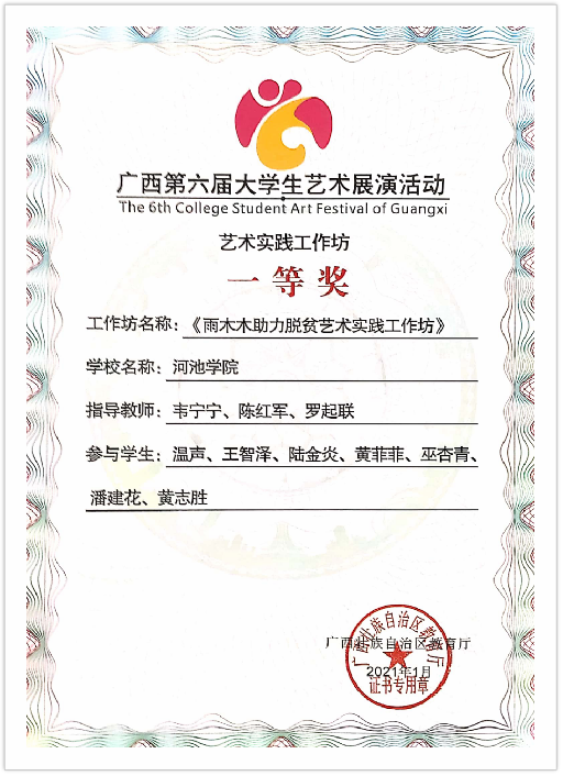 1.201412月,梁保满同学在广西第四届大学生艺术展演活动中荣获一等奖;石莲英、廖红、滕云、唐文正、曾慧云等同学荣分别获二等奖。