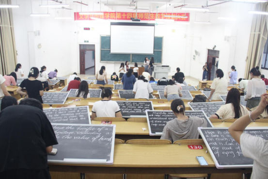 为切实提高师范生的英文板书技能,5月26日晚,外国语学院(国际教育学院)于格致楼-101教室举行“字字光华,笔笔生花”英文粉笔字大赛。