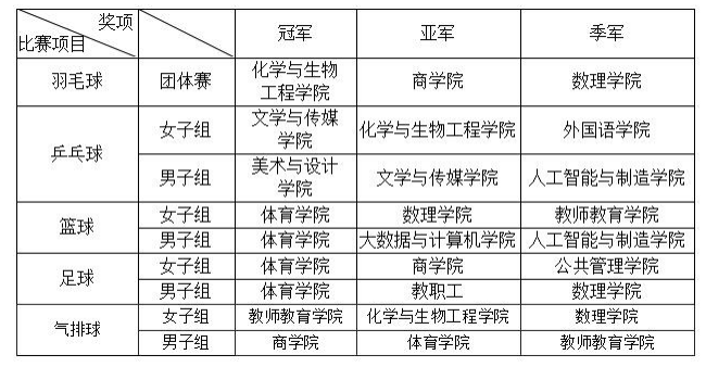 本届“五四杯”历时一个月,涵盖羽毛球、乒乓球、篮球、足球、气排球五大项目。最终化学与生物工程学院获得羽毛球项目团体赛冠军;文学与传媒学院女子组、美术与设计学院男子组获得乒乓球项目冠军;体育学院男子组、女子组分别获得篮球、足球项目冠军;教师教育学院女子组、商学院男子组获得气排球项目冠军。
