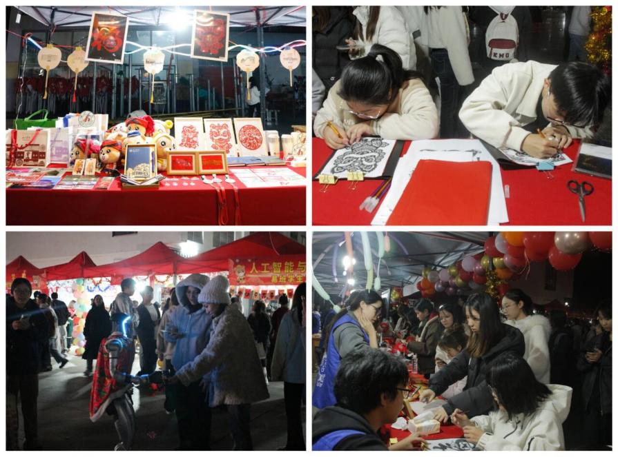 与此同时,新年游园活动区亦是一片欢腾。学校易班发展中心联合各二级学院工作站精心策划,设置了“灯影绣球DIY”“非遗校园拓画体验”“诗词飞花”“新年元素刻纸体验”等53项特色活动。民俗手工传递文化温度,文学互动浸润人文气息,各体验区人头攒动。同学们踊跃参与,热情高涨,游园区内欢声笑语此起彼伏,处处洋溢着蓬勃的朝气与新年的喜悦。