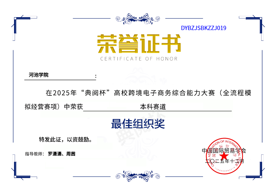 2025年12月30日,由中国国际贸易学会主办、湖南典阅教育科技有限公司承办的2025年“典阅杯”高校跨境电子商务综合能力大赛(全流程模拟经营赛项)举行全国总决赛线上颁奖仪式,获奖名单正式公布。我校外国语学院23商英学生蓝尉瑜、杨振苏、潘静妮、秦燕、何星雨、廖洁怡组成的河池学院二队荣获学生组本科赛道一等奖,赵乐诗、黎桂芬、刘静、韦盈、李霜、赵怡兰组成的河池学院一队荣获学生组本科赛道三等奖,学校获评本科赛道“最佳组织奖”。