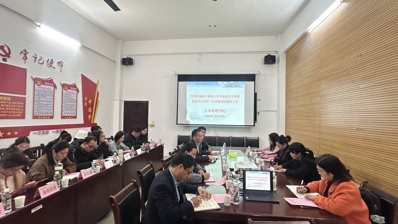 12月16日,南宁师范大学马克思主义学院党委书记李玲一行4人到我校公共管理学院开展帮扶共建活动。公共管理学院领导班子、各党支部书记、教研室负责人、部分专任教师以及马克思主义学院副院长张明进参加活动。
