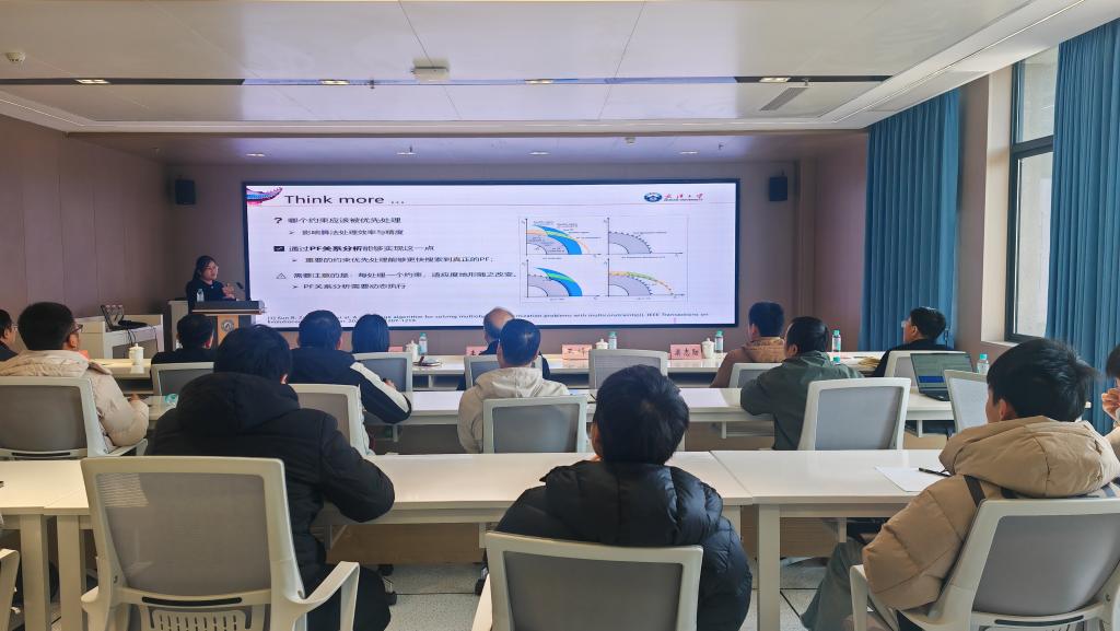 首场报告中,王峰作“基于Pareto前沿关系分析的约束多目标优化”专题报告。作为连续五年入选全球前2%顶尖学者,王峰从约束多目标优化问题的核心矛盾切入,清晰界定了无约束帕累托前沿(UPF)与约束帕累托前沿(CPF)的概念及四类关系。他详细阐述了双种群双阶段搜索框架、前沿关系分类适配等关键方法,结合建筑工程优化、工业系统设计等典型应用场景,展示了该理论在解决复杂工程问题中的实践价值。报告中,王峰还分享了基金申报心得,强调立项依据需契合国家战略,研究内容应突出创新点与可行性,为师生科研项目申报提供了重要指引。