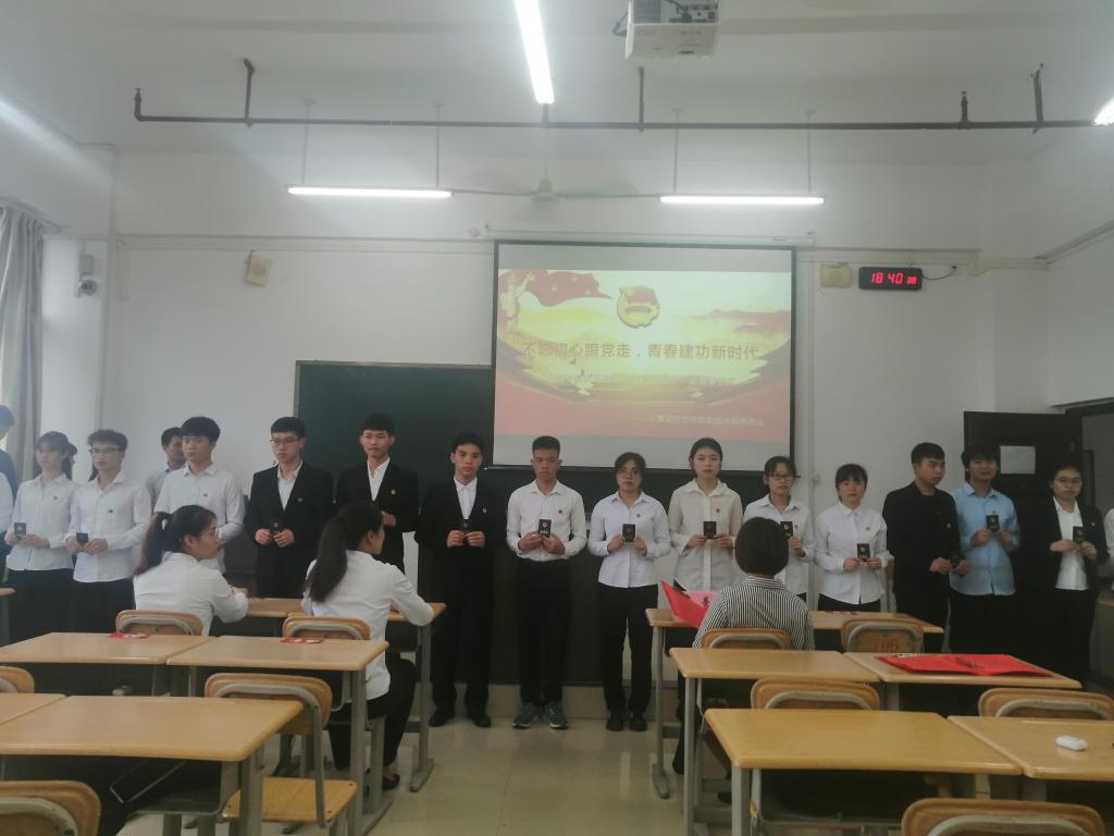 仪式在庄严的国歌声中拉开帷幕,学院团委书记罗曼老师宣读新团员名单,学院优秀团员代表为新团员佩戴团徽、颁发团员证。随后,学院团委副书记周罗婷带领新团员宣誓,老团员重温入团誓词。入团介绍人代表刘婕向新团员宣读《共产主义青年团章程》中有关团员的义务和权利的条款,新团员代表韦彦杉、老团员代表韦智胧先后发言。最后,罗曼老师对全体团员提出期望,她希望同学们不仅在形式上入团,更要在思想上入团,今后要更加严格要求自己,严格遵守团章,履行团员义务,时时处处起到模范带头作用。同时希望同学们能坚定信念,坚强意志,厚植爱国情怀,知史爱党、知史爱国,铭记光辉历史,传承红色基因,不断提高内在素质,锤炼过硬本领,努力成长为“模范表率、堪当重任”的共青团员,为中国共产党的百年华诞献礼。