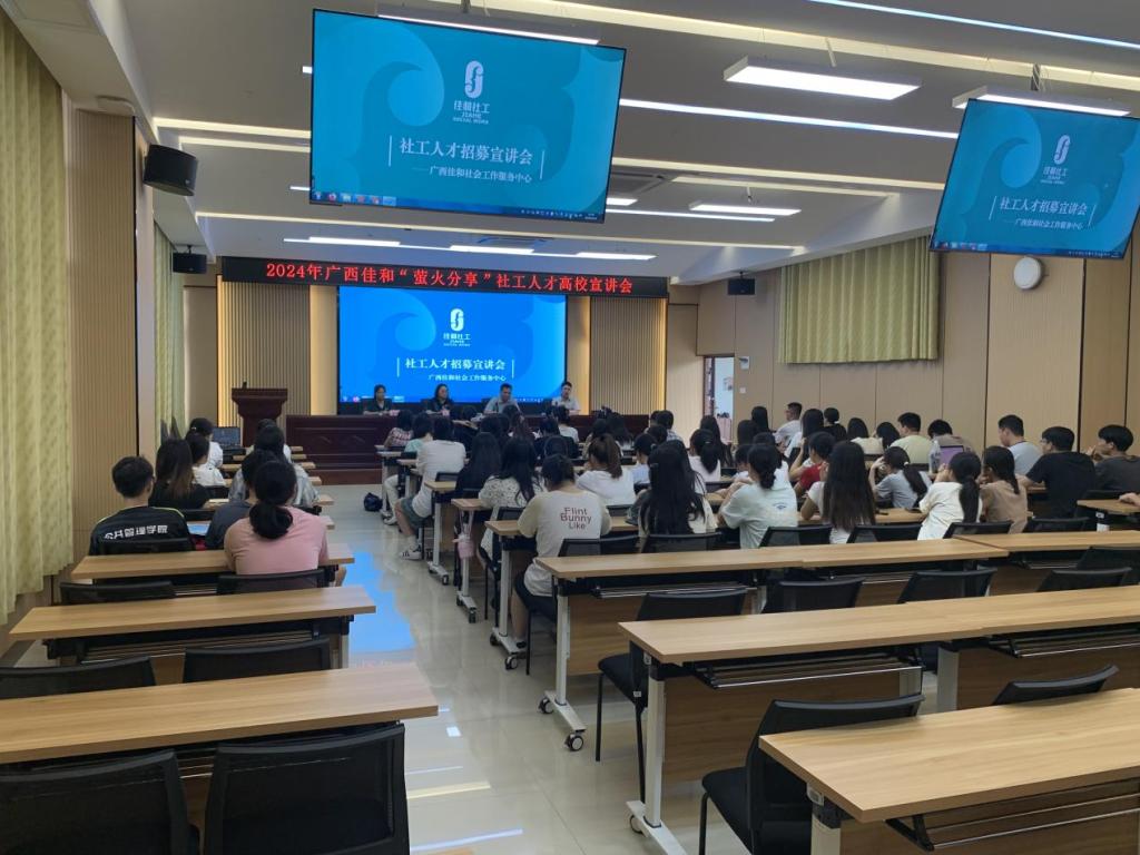6月19日下午,公共管理学院在格致楼102室举行校园招聘专场宣讲会,广西佳和社会工作服务中心副总干事周小幸、项目主管隆美香到场宣讲。学院党委副书记钟卓良、社会工作教研室主任蓝振松、负责就业工作辅导员黄江凯,以及2024届、2025届社会工作专业学生80多人参加了宣讲会。