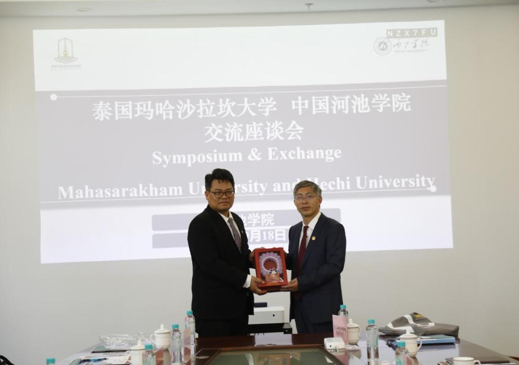 From September 17 to 19, a delegation from Mahasarakham University of Thailand visited our university for a three-day industrial cooperation exchange. The delegation, led by President Prayook Srivilai, was received by Ma Shaojian—Deputy Secretary of the University Party Committee and President of Hechi University—in Conference Room 1507 of Zhiyuan Building.  Vice Presidents Qin Yongling and He Weiguo also presented at the meeting.