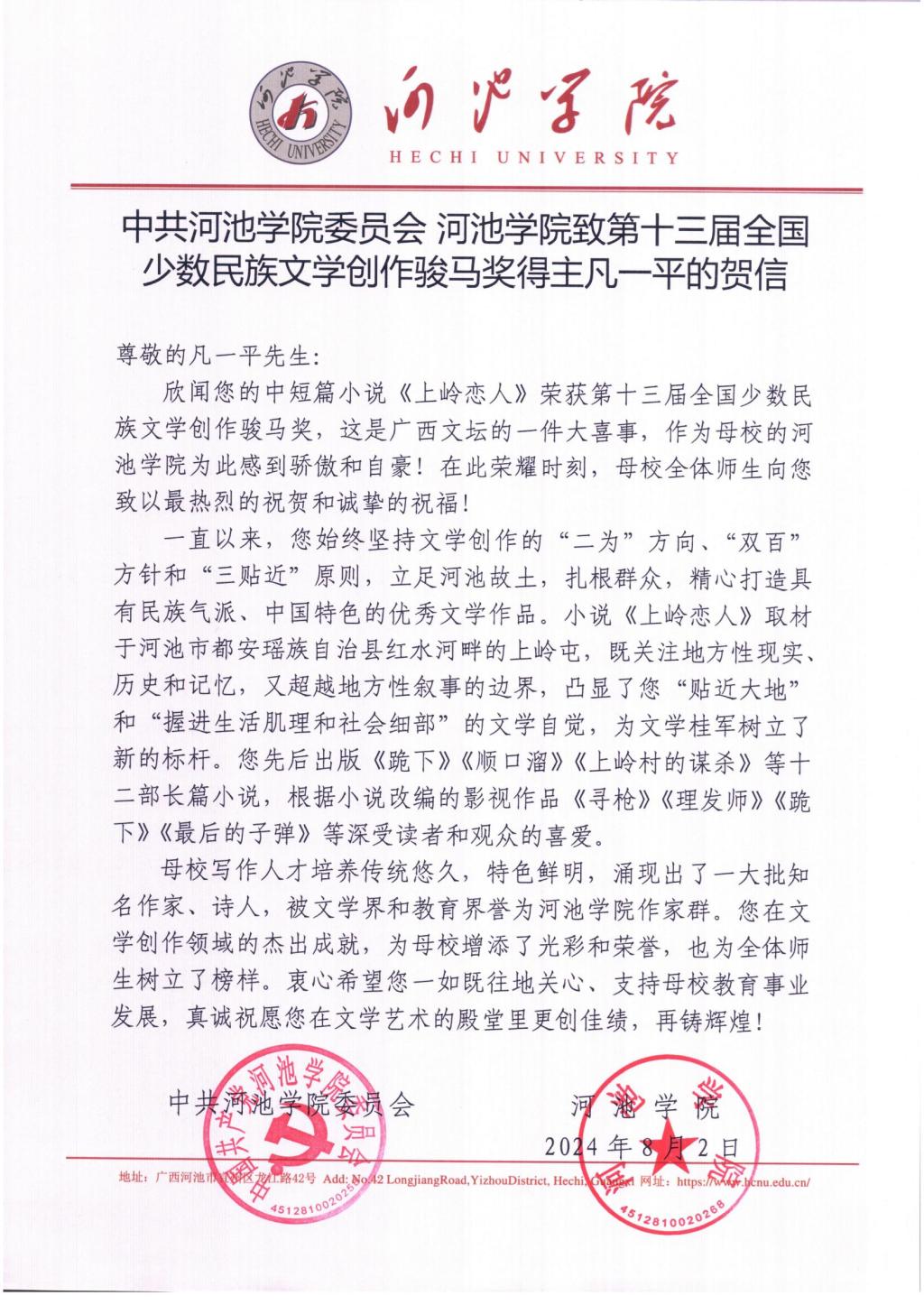 中共河池学院委员会 河池学院致第十三届全国少数民族文学创作骏马奖得主凡一平的贺信