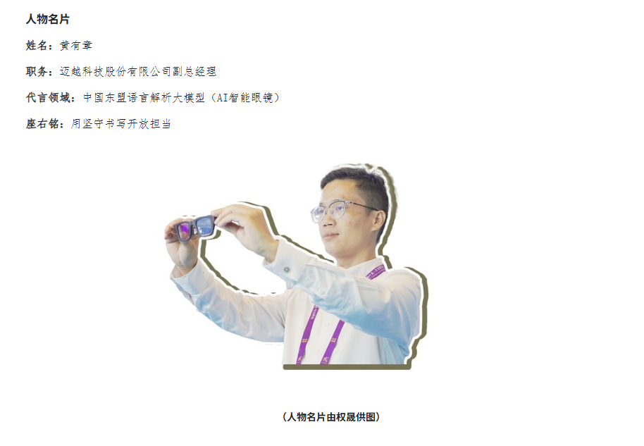 2025年9月,第22届东博会、峰会上,迈越科技研发的智能翻译眼镜一战成名。开幕式上,自治区党委书记佩戴眼镜致辞的画面,迅速成为各大媒体关注的焦点。“当陈刚书记说出‘广西企业生产’时,我在后台激动得手都抖了。”黄有章坦言,那一刻,所有艰辛都有了回报。