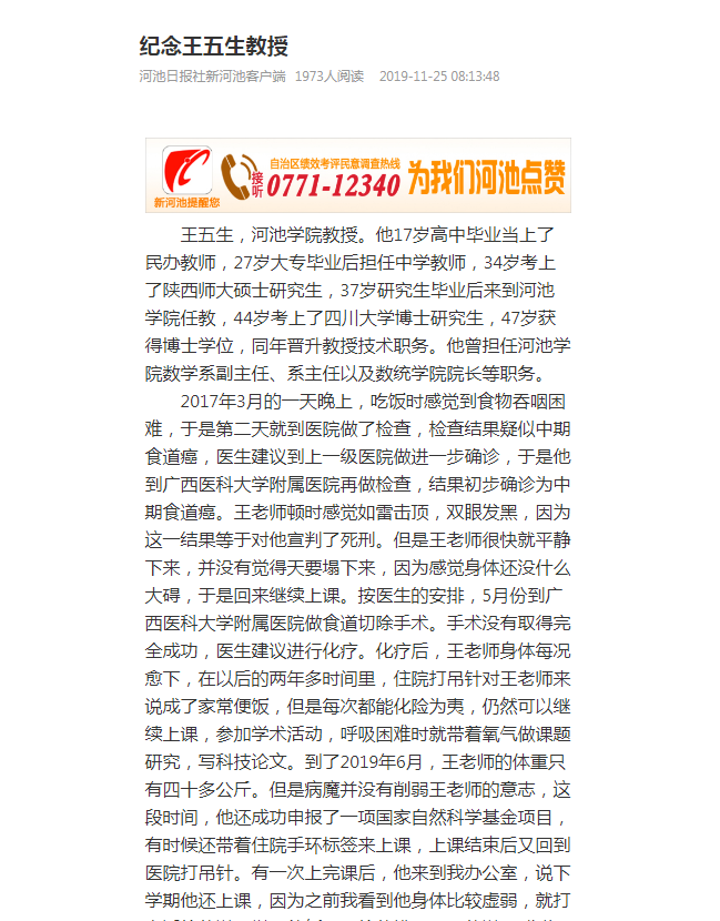 12-052019【中工教育】一生只做一件事——追忆河池学院教授王五生纪念王五生教授2019年9月15日,王五生老师因病去世,永远地离开了他深深眷恋的工作岗位。王五生,河池学院教授、数学与统计学院院长。王五生老师从事教育工作近43年,怀着“一生只做一件事”的教育情怀,长期奋斗在教育事业的第一线。他默默耕耘,任劳任怨,在平凡的岗位上坚守初心,用生命的光辉,追梦筑梦。王五生老师生前连续获得3项国家自然科学基金项目,3项广西自科基金项目。在国内外学术刊物发表论文170多篇,其中被外文三大索引收录9... -
