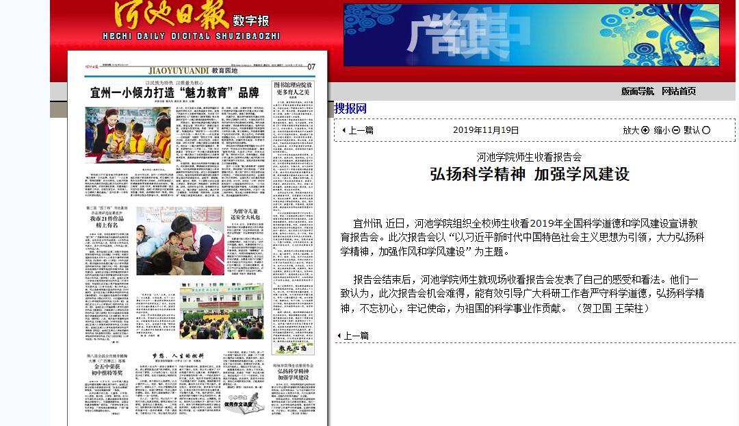 11-192019【河池日报】河池学院师生收看报告会弘扬科学精神 加强学风建设宜州讯 近日,河池学院组织全校师生收看2019年全国科学道德和学风建设宣讲教育报告会。此次报告会以“以习近平新时代中国特色社会主义思想为引领,大力弘扬科学精神,加强作风和学风建设”为主题。报告会结束后,河池学院师生就现场收看报告会发表了自己的感受和看法。他们一致认为,此次报告会机会难得,能有效引导广大科研工作者严守科学道德、弘扬科学精神、不忘初心、牢记使命,为祖国的科学事业作贡献。 (贺卫国 王荣柱... -