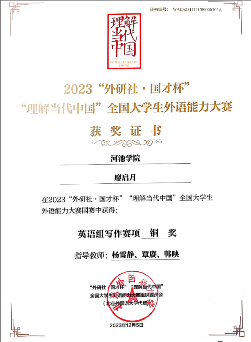(学生荣获2023年“理解当代中国”英语写作大赛全国铜奖